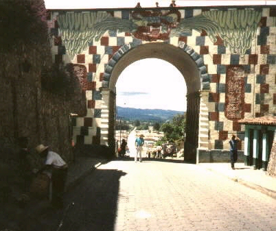 We opted to take the public bus to Antigua rather than a tour bus, which would have restricted our time in the old city. This was an adventure in itself and better than any ride at Disney World. Guatemalans are on the whole a people of small stature and they are under the impression that a bus seat meant for two people must hold three Guatemalans. Unfortunately, the ones that elected to ride our bus must have all been mutants-we were packed like the proverbial sardines. That was nothing compared to what was to come. Once that bus got on that narrow mountain road, it didn't stop for anything, except to pick up some more passengers and it once slowed down because some people were standing by the side of the road looking down the ravine where some unlucky driver had gone over the edge. Up and down hills, round narrow hairpin bends, I still don't know how that bus driver managed to keep the bus on the road. I am probably better off not knowing.