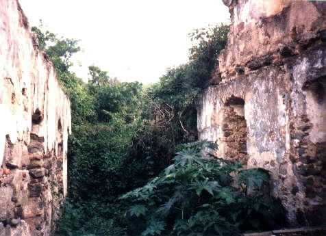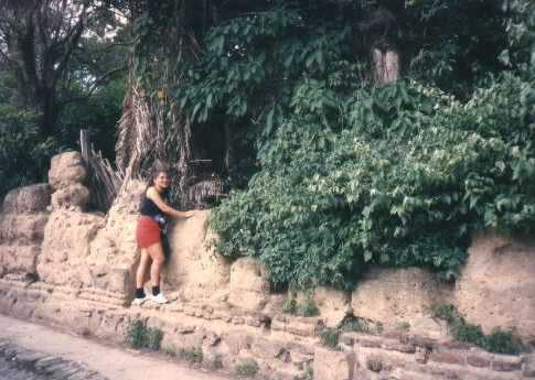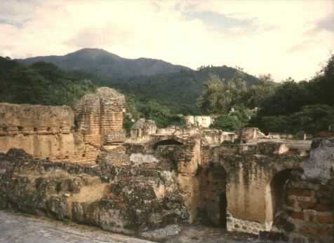 By now it was getting late in the afternoon and we still had one more ruin to try and see--La Merced. Somehow we got turned around and headed the wrong way-so much for my unerring sense of direction. We found ourselves near the outskirts of the old town and came upon a ruin surrounded by a low stone wall, which looked something like the wall that surrounded the dead city. By now Joan and Wayne were exhausted, so they decided to have a rest while Mirian and I explored this last ruin. None of us felt enthusiastic about returning to Guatemala City on that bus in the dark.