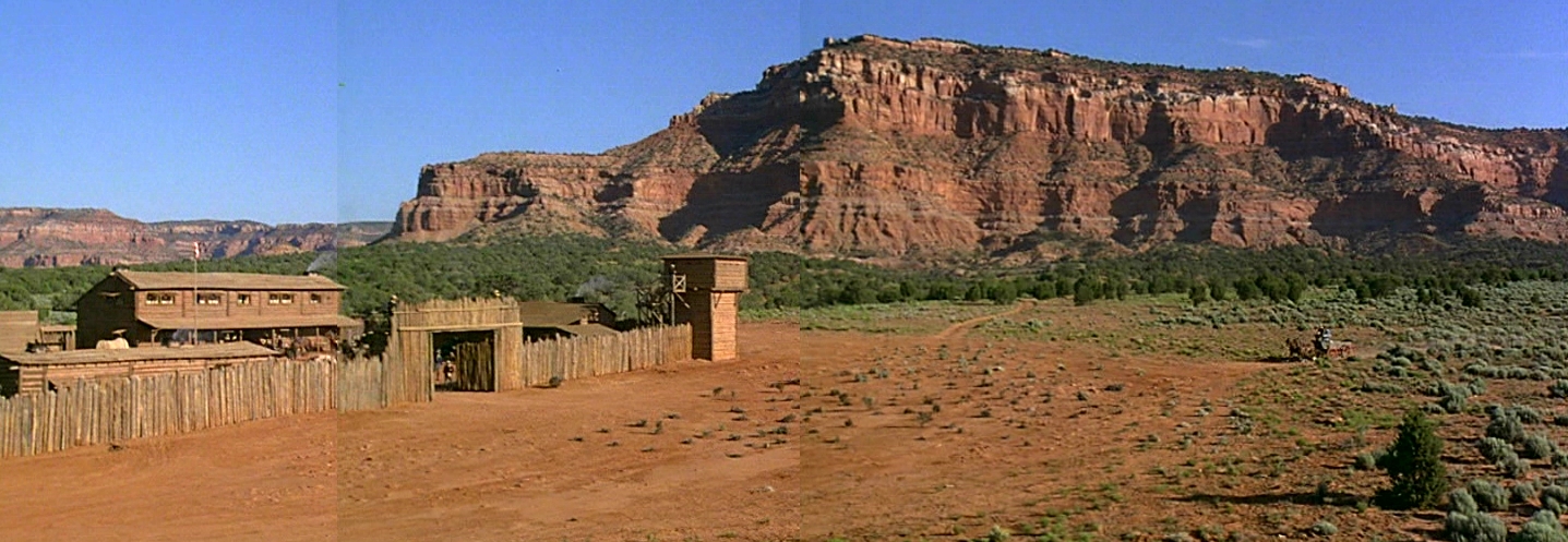 The remains of the Kanab Movie Fort are located west of the Kanab Municipal Airport about a mile north of the Arizona border. Above is a composite image of the fort just prior to it being partially burned to the ground in 1979.