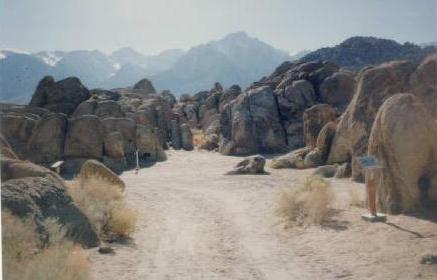 DIRECTIONS: From Los Angeles, take Interstate 5 north to the Antelope Valley Freeway (14) north. At Highway 395, take it north. About an hour's drive past Red Rock Canyon, you will reach Lone Pine. At the only traffic light in the city is Whitney Portal Road. A short drive west will take you to the Alabama Hills where the majority of filming took place in the area. To the east of town is the old railroad station (now a private residence) and other sites which will have detailed instructions on their separate web pages when published.