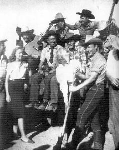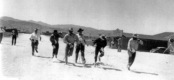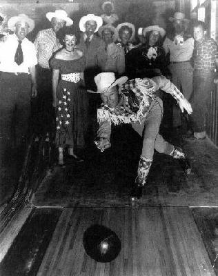 Roy Rogers throwing the first ball down the alley in the Pioneertown Bowl. Some of the Sons of the Pioneers in the background.