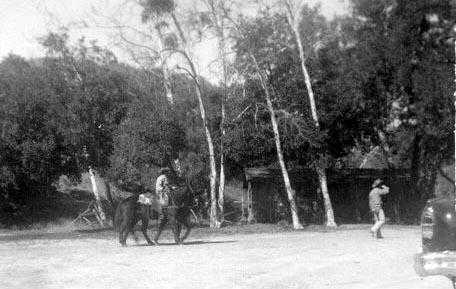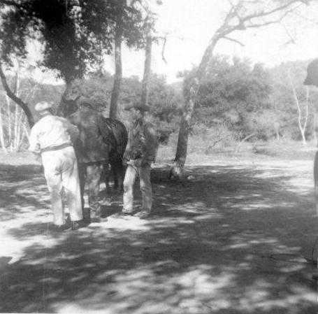 Dick Jones on right, in front of the famous Placerita hide-out cabin (Walker Ranch). Wranglers with his horse, on left.