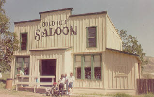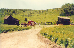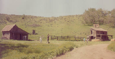 Farther up the road and off onto a side road was the location of the small town used in the Father Murphy television series (see photo to right). Other standing sets in this area of the ranch include from Little House on the Prairie (see Walnut Grove photo below), the Jonathon Garvey house and barn, and the Laura Ingalls Wilder house and barn (her second of three houses on the show); from Gunsmoke, the 3-sided house and barn; a house used in The Miracle Worker, starring Patty Duke, which stands at a site with a barn and outbuilding; and the newest permanent set at the ranch, a church which can double as a school (it was designed by Debra Early). If it still existed, from the church you could see the entire town of Walnut Grove used in Little House on the Prairie (Michael Landon blew them up for the final episode).