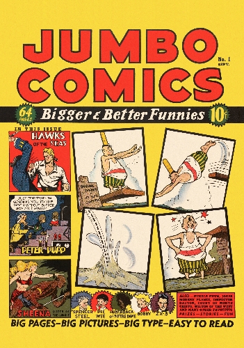 JUMBO COMICS #1, September 1938 This is a slightly downsized reprint of the very first comic book published by the original Fiction House publishing company: JUMBO COMICS #1, September 1938. It featured the following comics, originally printed in black 'n' white on colored paper: PETER PUPP, HAWKS OF THE SEAS, BOBBY, PUZZLE PHUN, THE COUNT OF MONTE CRISTO, SPENCER STEEL, THE DIARY OF DR. HAYWARD, UNCLE OTTO, STARS ON PARADE, JEST LAFFS, PEE WEE, SHEENA QUEEN OF THE JUNGLE, MODERN 'PLANES AND MODEL BUILDING, GILDA GAY THE MODERN GIRL, PUZZLE PHUN, LOST IN THE ARCTIC (text story) by Owen Finbar, THE HUNCHBACK OF NOTRE DAME, THE ADVENTURES OF TOM SHERRILL, ZX-5 SPIES IN ACTION, HEROES OF SPORT, ISLAND OF GOLD (text story) by Capt. Dennis Drake, JUMBO JIM'S PRIZE PARTY, INSPECTOR DAYTON, WILTON OF THE WEST, and JEST LAFFS.
