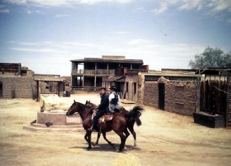 Benson Fong (Charlie Chan movies) and Donnelley Rhodes (Soap) riding into the deserted Old Tucson mission square. Photo taken from mission porch--note saloon on Main Street behind them.