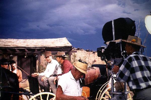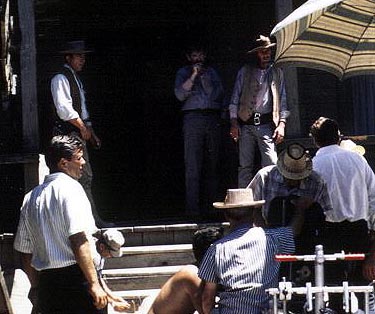 Left to right: Donnelley Rhodes, unidentified actress, John Mills, Sean Garrison, unidentified camera assistant, Jack Marta (director of photography) behind camera, rehearsing a scene for Dundee & The Culhane--Old Tucson, 1967. Note the Arizona afternoon sky. We had gully washers every night.