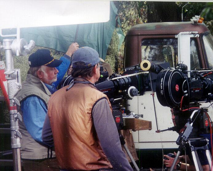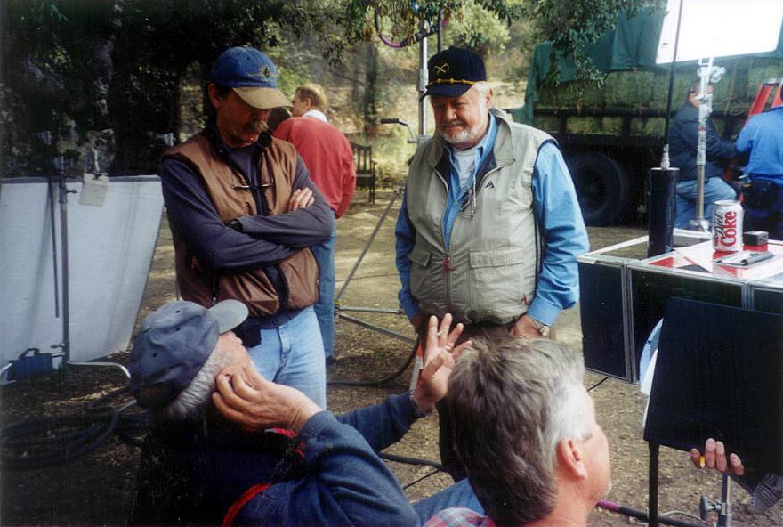 (right, back to camera), discuss the next shot with Director of Photography, Jim Wrenn (left) and Camera Operator, Frank Q. Dobbs.