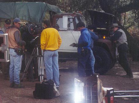 Robert Urich (far right) and Zach Bostrom (partially hidden), discuss problems with a truck engine while shooting a scene from Animal Planet's,
