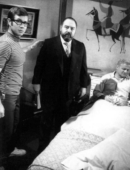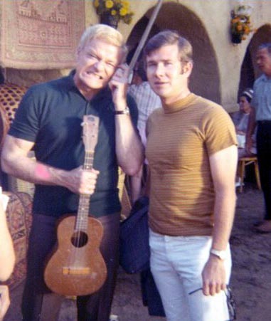 Brian Keith relaxing between scenes on Family Affair. Norman Stevens, one-time president of the Screen Extras Guild, on the left, working as an extra, of course.