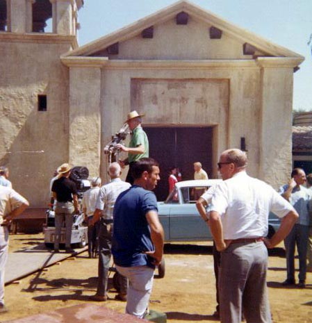 John Stephens (Production Manager) and Ed Hartman (Producer) on Family Affair set, back lot of CBS Studio Center (formerly Republic Studios). Family Affair usually took place in a New York apartment setting. For this particular show we were shooting a two-part episode dealing with the twins getting lost on an European vacation--therefore, the back lot.