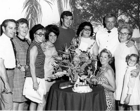 Someone's birthday party on the Family Affair set, 1968 season. LtoR: Dick Cobos, makeup; Katherine Deeny, The kid's teacher; Julie Gibson, dialogue coach (later married Charlie Barton, the director); Iris Kramer, standin; Steve Lodge, costumer; Paula Jones, Annisa's mother; Brian Keith, "Uncle Bill"; Armine, hairdresser; Anissa Jones, "Buffy"; Thelma Strom, key costumer (sitting at table in foreground).