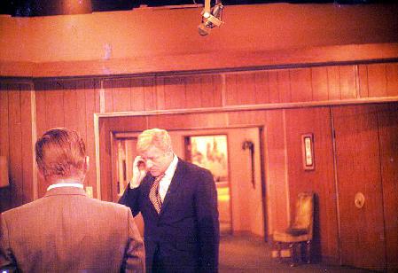Sebastian Cabot running his lines; his Costumer (me) slinking away after making sure his tie was tied just right.