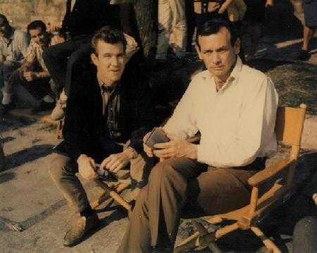 David Janssen and his costumer, Stephen Lodge, on the set. Some of the crew are seen in the background.