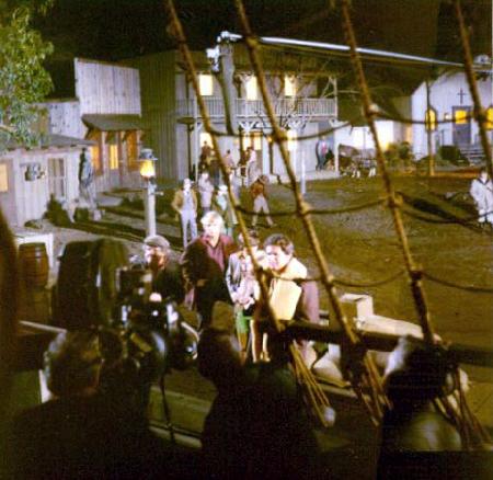 Henry Beckman (Captain Clancy), David Soul (Joshua), Bobby Sherman (Jeremy), and Robert Brown (Jason) shoot a night scene for Here Come The Brides at the Columbia Ranch in Burbank, California. Captain Clancy's ship, in foreground, was built on rollers. We could make the ship appear to dock and cast off by rolling the entire ship set into frame, and out. We also moved the ship to the Western Street when the boys took a trip to another port, and onto the sound stage for at sea scenes.