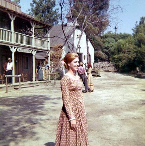 Good shot showing the Here Come The Brides Seattle Street (same berm used as the Camp Runamuck girl's camp, Camp Divine, a few years earlier), featuring one of the Brides, Jill Janssen; my own bride in 1969.