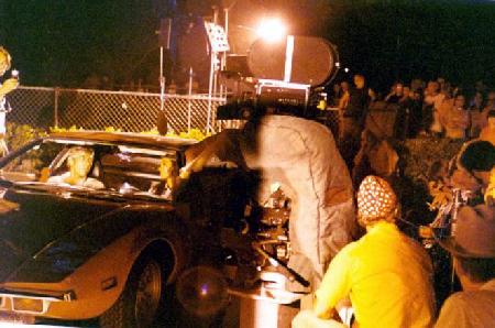 In the movie, Anne, playing a rich girl, bails Jim out of jail, and literally takes him for a ride. Here we are shooting the scene as they first get into the car (a Ford Pantera--one of only two in the country at the time).