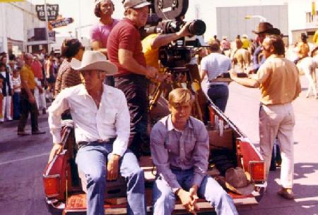 James Coburn (as Lew Lathrop) and Ted Eckles (playing his son) ride on the camera car when they are not needed in the shot during the parade sequence. This was not a real parade that we were "allowed" to shoot; it was created by Levy-Gardener-Laven, the producers of The Honkers especially for the movie: 17,000 local people turned out for the gala event, including 60 plus parade entrants (bands, floats, horse groups, etc.). The sequence utilized five cameras, and we actually ran the parade around the block so we could shoot it over and over again to get the required coverage.