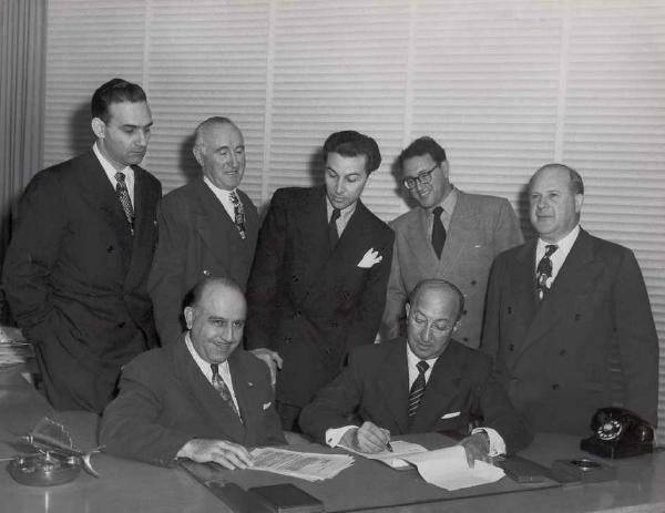 Edward Nassour standing in center, Donald Crisp (second from left and a silent partner), William Nassour seated to the left and producer Sam Bishoff seated to the right.