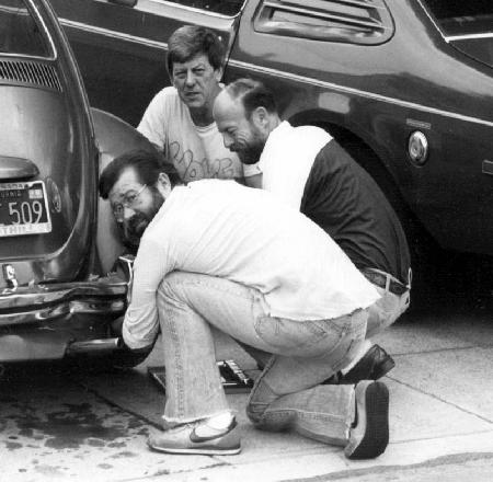 Close friends and neighbors, Steve Lodge, actor Hoke Howell, and Wally Van Allen (assistant director), trying to fix a bent bumper.