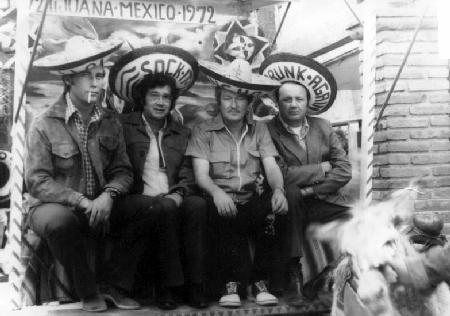 L to R: Writers Dave Cass and Steve Lodge, Mike Cusack, president, MFC FIlms, and director Frank Q. Dobbs--on an excursion to Tijuana, Mexico, in 1972. Would you believe this was part of a business trip?