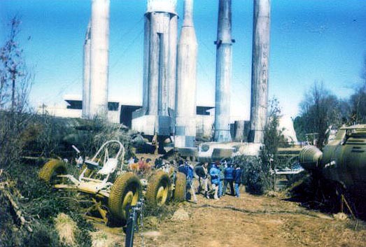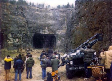 Shooting on location at Huntsville's Space Museum, the historical rockets and space vehicles were aged and dirtied down to make them appear as if they have survived a nuclear holocaust. Here the crew searches for a camera setup, Director Richard Compton in blue coat.