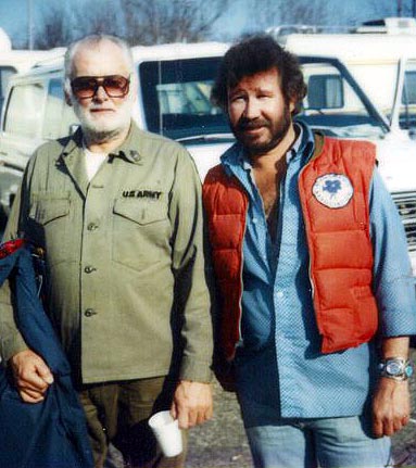 Art Carney and Steve Lodge on location for Ravagers in Huntsville, Alabama, 1978. Carney had a pretty small part at first (basically a cameo), but when the executives watched him in dailies back in Hollywood, the script was rewritten and his part grew considerably.