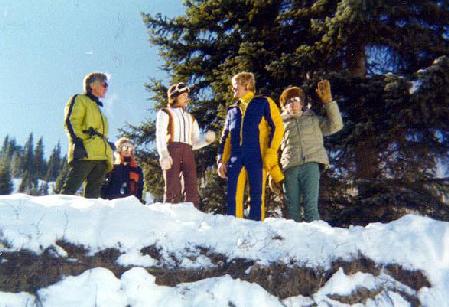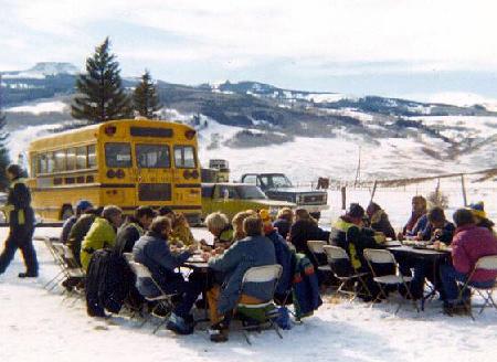 The cast and crew of Snowbeast eating lunch on the 10,000 foot Crested Butte, Colorado, location--a restaurant with a great view!