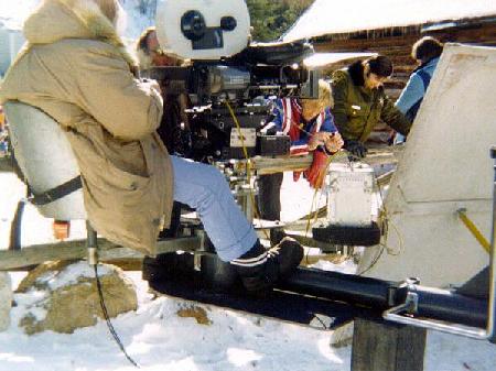 Bo Svenson keeping warm between shots. We had loads of these gas powered heaters on the set, used to keep the camera and film warm; also the cast and crew. It rarely got above 5 degrees during the day, 30 below at night.