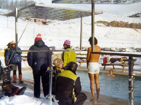 Bob Logan (in swim trunks) shivers while Bo Svenson waits in heated pool for director Herb Wallerstein (in purple cap) to call action. During their closeups, both actor's hair froze because of the below-zero weather. If you look close at the film on TV, you can actually see their hair freeze before your eyes as the scene progresses.