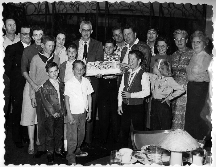 (l to r) Bruce Cramer, Jerry Bourlette (glasses), Ruth Cramer, Mike Cramer (boy), Grady Cramer (little boy), Mrs. Bourlette, Linda Cramer (little girl), Randy Straight, Billy Mitchell (tall with tie), Tommy Bresh, Cory Rodgers, Lloyd Straight, Ricky Straight (boy), Dusty Rogers, Mickey Straight, Kathy Mitchell, Elsie Mitchell, and Ruth Bresh.