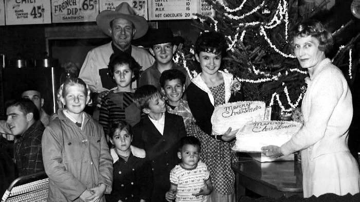 From top down: Crash Corrigan, Tommy Bresh, unknown, unknown, Elaine DuPont (with cake), Kathy Mitchell, unknown, Randy Straight (head turned), and Melody McCord's mother (with cake)