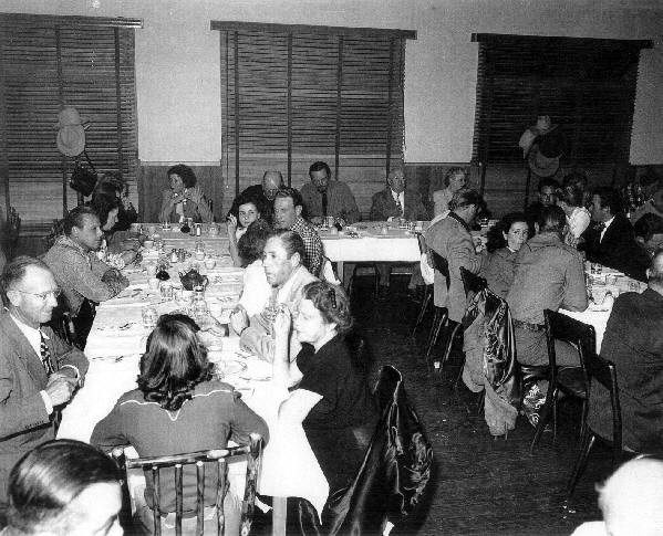 Roy Rogers throwing the first ball down the alley in the Pioneertown Bowl. Some of the Sons of the Pioneers in the background.
