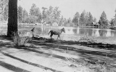 Originally known as Bartlett Lake when the dam was built to create the lake, it was later renamed as Cedar Lake. Most of the sets at the lake were built for the 1936 film "Trail of the Lonesome Pine". Because of safety issues, the mill at the dam was torn down in the 1990's and a replica erected in its place.