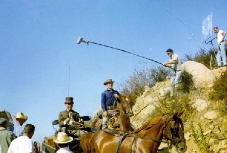 Dundee (John Mills in his American TV debut) and The Culhane (Sean Garrison) in buckboard shoot a scene for the series at the Bell Movie Ranch. Chuck Wilbourn is sound boom man in background.