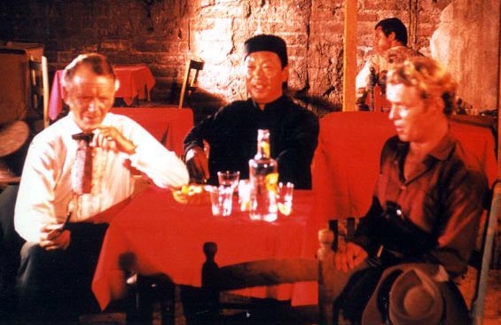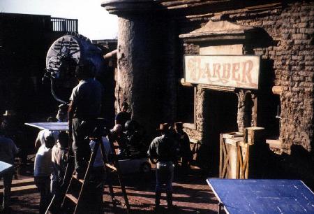 A practical interior (inside a real adobe building) in Old Tucson. It was over 100 degrees outside; when all the lighting was done, the actors had to play their scene in extremely hot circumstances. Left to right: John Mills, Benson Fong, Sean Garrison. Extra in background is Jeff Sneller, a Tucson local at the time--later to co-write the original Kingdom of the Spiders screenplay with Yours Truly. All the actor's clothing was soaked in sweat when this photo was taken so no sweat stains are seen.