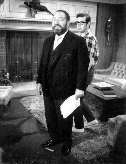 Sebastian Cabot running his lines; his Costumer (me) slinking away after making sure his tie was tied just right.