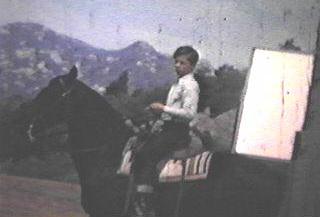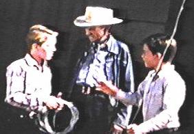 Ronald Keith, Bill Fawcett, and Bobby Diamond doing a scene in front of the Fury barn at Upper Iversons ranch.