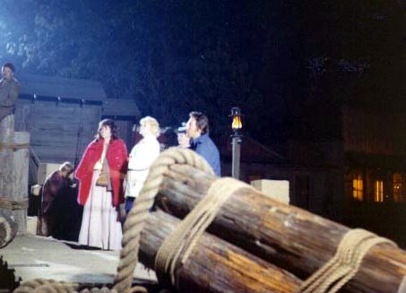 Henry Beckman (Captain Clancy), David Soul (Joshua), Bobby Sherman (Jeremy), and Robert Brown (Jason) shoot a night scene for Here Come The Brides at the Columbia Ranch in Burbank, California. Captain Clancy's ship, in foreground, was built on rollers. We could make the ship appear to dock and cast off by rolling the entire ship set into frame, and out. We also moved the ship to the Western Street when the boys took a trip to another port, and onto the sound stage for at sea scenes.