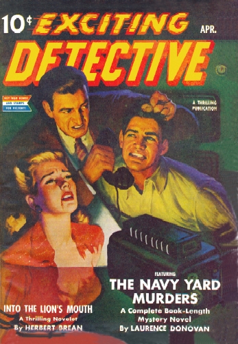 EXCITING DETECTIVE, April 1943 THE NAVY YARD MURDERS by Laurence Donovan INTO THE LION'S MOUTH by Herbert Brean FORCE OF HABIT by John Krill BLOODY FLOOD TIDE by C. K. M. Scanlon Pulp-Sized Magazine: 7 x 10 inch 116 pages $14.95