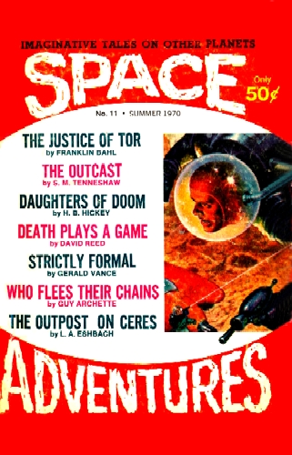 SPACE ADVENTURES #11, Summer 1970 Contents: THE JUSTICE OF TOR by Franklin Bahl THE OUTPOST ON CERES by L. A. Eshbach THE OUTCAST by S. M. Tenneshaw DAUGHTERS OF DOOM by H. B. Hickey DEATH PLAYS A GAME by David Reed STRICTLY FORMAL by Gerald Vance WHO FLEES THEIR CHAINS by Guy Archette Digest Magazine: 5.5 x 8.5 inch 132 pages $14.95