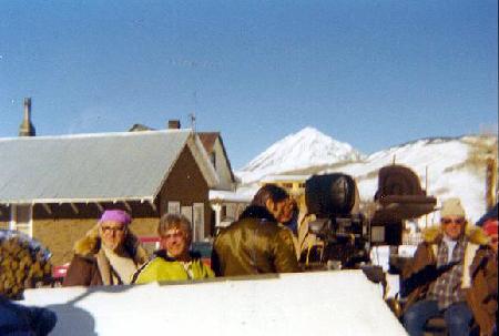 L to R: Director of Photography, Frank Stanley; director, Herb Wallerstein; Clint Walker; and the camera crew, prepare for a scene in downtown Crested Butte, Colorado. Note the white "Stanleyboard" in foreground--Frank Stanley was famous for these; they reflected a softer light than the usual foil reflectors, or nine-lights.